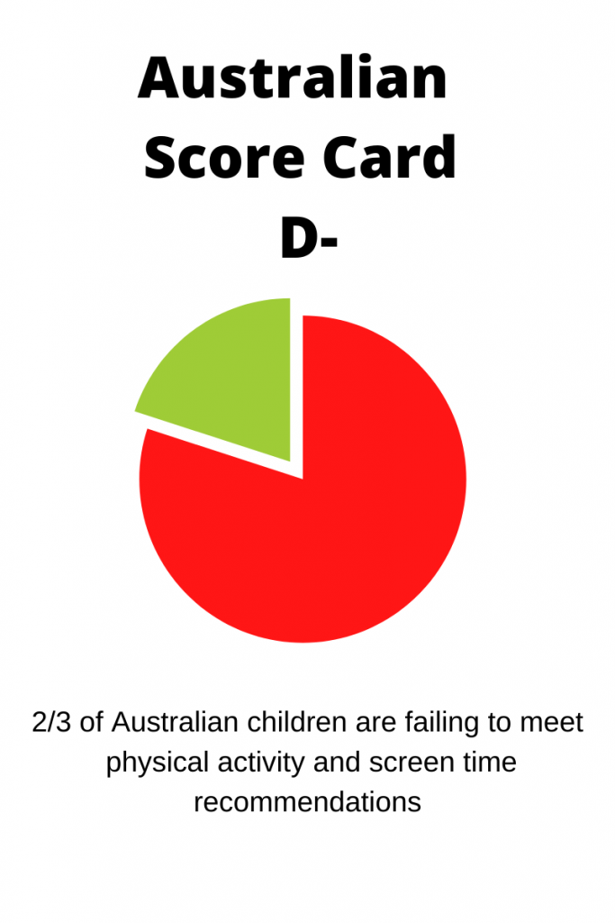 Gli ultimi dati che abbiamo in Australia sono nella Active Healthy Kids Australia Report Card , che è un rapporto fatto ogni due anni sull’attività fisica dei bambini di tutto il mondo. I risultati del 2018 per l’Australia sono stati molto deludenti in quanto abbiamo ottenuto solo un punteggio di D- e l’Australia si è classificata al 32° posto su 49 paesi che hanno partecipato allo studio.